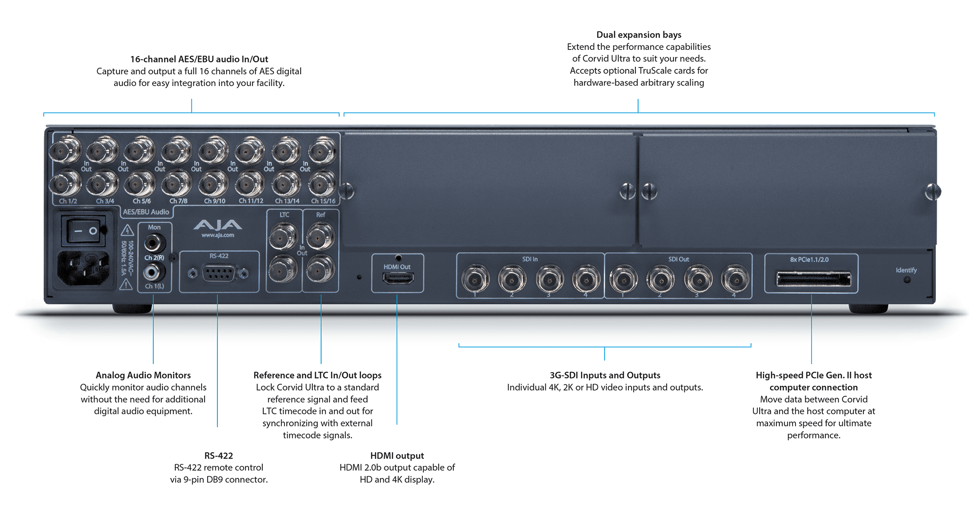 AJA의 Developer Program (개발) 파트너로 설계된 Corvid Ultra는 전례없는 처리 능력을 OEM 제품으로 제공합니다. 빠른 8 x PCIe 2.0 호스트 연결을 통해 각 방향으로 2500+ MB / s의 데이터 전송 속도를 제공하며, 이미지 처리는 까다로운 애플리케이션을위한 풀 컬러 공간 변환을 최대 16-bit RGB 색상 심도로 합니다.